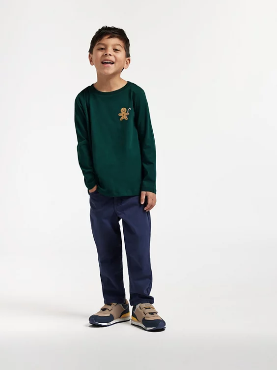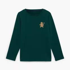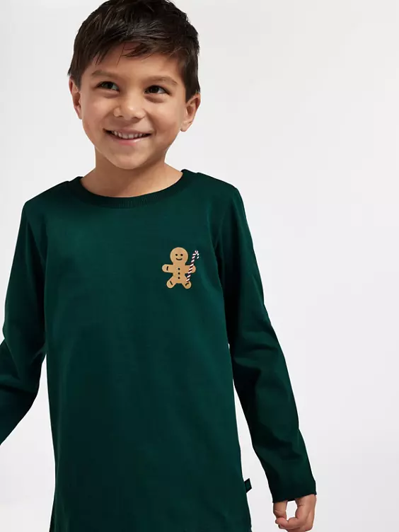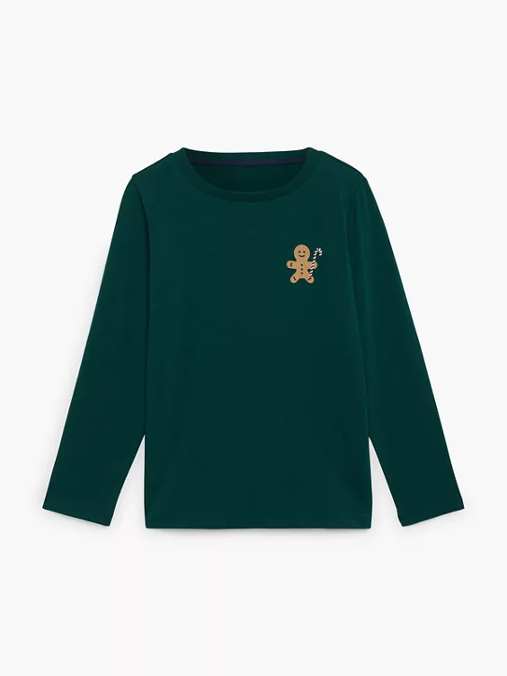 - grünes Langarmshirt mit kleinem Weihnachts-Druck auf der Brust